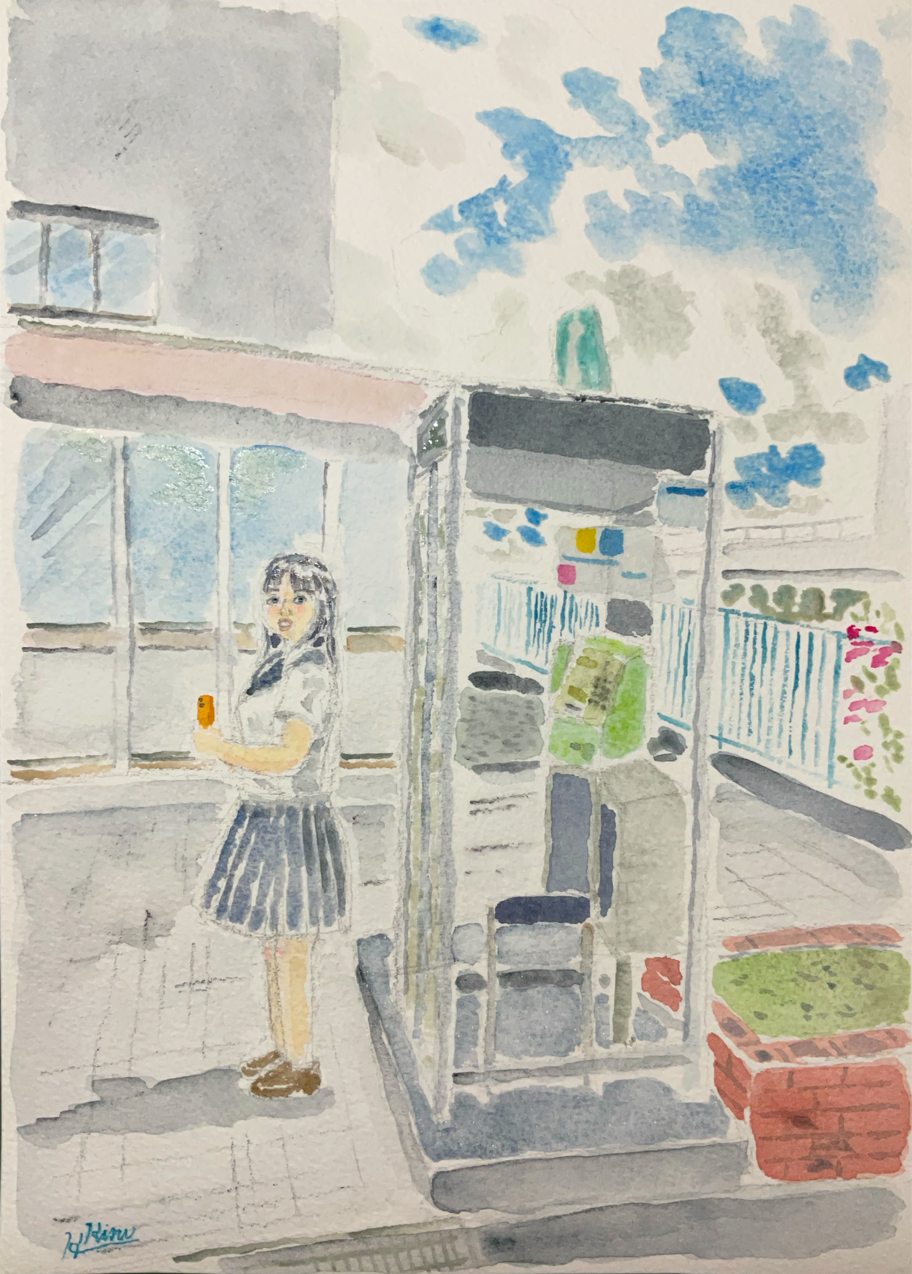 素材技法:日本画、水彩画解説:青い陽射しが優しく街を照らす午後、公衆電話と一緒に親友を待っている。手にはマイスマホを大切に握り、その画面には友達からのメッセージが次々と表示されている。