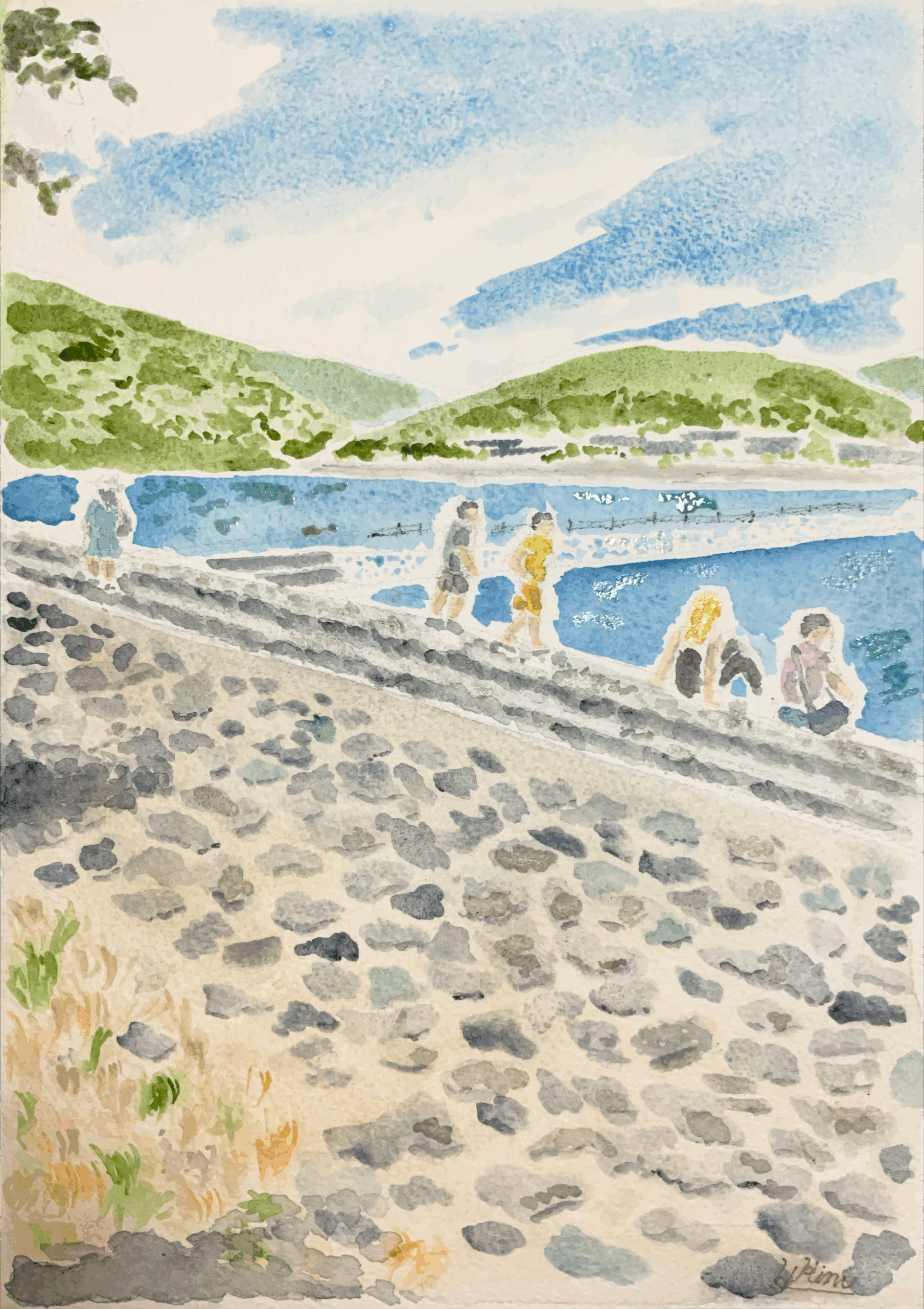 解説:秋の陽ざしがぽかぽかと、川の煌めきがぴょんぴょんと、私はわくわく、そわそわと。大勢の人と一緒に渡月橋をてくてく、こつこつ渡ります。「わぁっ!」足もとからとことこ風が駆け抜けて、スカートの裾がひらりと翻り私の声も翻る。やっとこさと河岸にちょこんと腰おろし、「ふぅ~っ」と小さなため息こぼれます。「やっと座れた……えへへ」ぱしゃぱしゃ川の音、にこにこ観光客の声、ふわっと甘菓子の香りであたりをくるくる見回すよ。私の胸の中もぽわんとあたたかくなって、にこにこ笑顔がこぼれます。