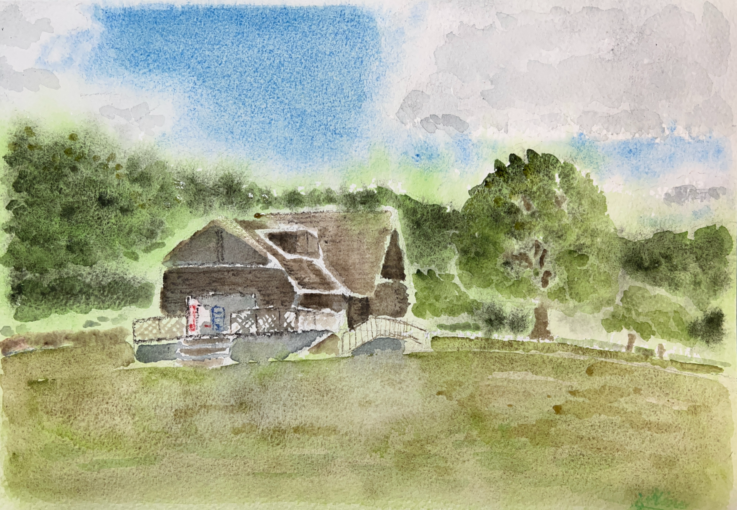 Landscape 【Painting】シークレットベース〜花時計があった頃〜 素材技法:日本画、水彩画解説:ログハウスの大きな窓から差し込む柔らかな日差しが、床に小さな光のスポットを作っています。その中に座る私は、少し赤くなった頬と乱れた髪の毛を整え、野原での冒険を思い出しながら、笑顔でジュースを飲んでいます。 2026.03.08 LandscapePaintings