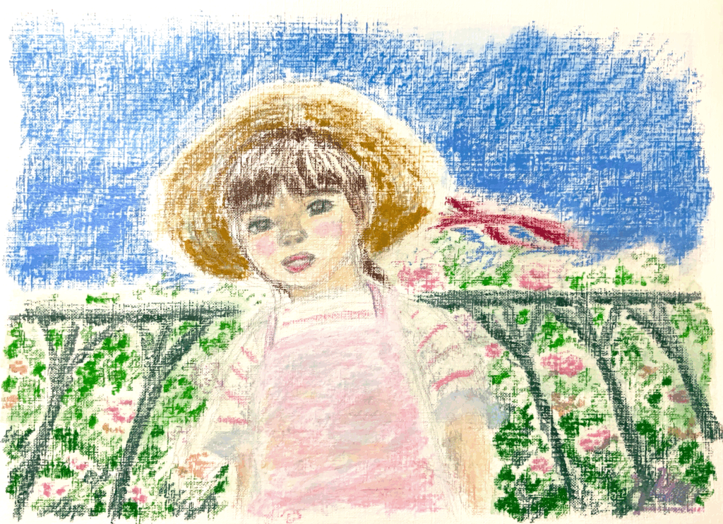 解説:小さな手に握りしめたジョウロをもって庭へ駆け出す。「今日はどうかな?」胸をときめかせながら、そっと土の表面を覗き込む。数週間前、学校からもらった小さな花の種を大切に植え、毎日欠かさず水やりをしていた。「わぁ!」そこには薄緑色の小さな芽が、ひょっこりと顔を出していた。私の瞳はみずみずしく輝き、頬はほんのりピンク色に染まる。「おはようございます!私の朝顔さん」