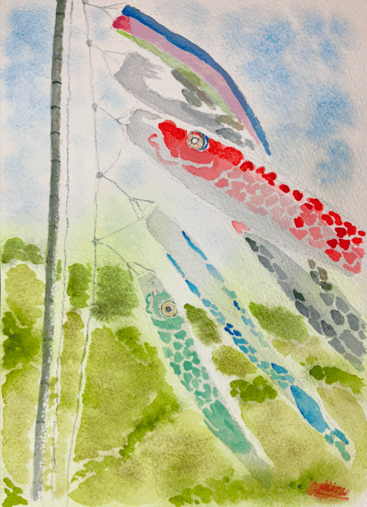 解説:10メートルもの巨大な鯉のぼりが空を悠々と泳いでいた。僕はその下で口をあんぐりと開け、まるで自分が小さな石ころになったかのように鯉を見上げている。のぼりの尾がはためくたび、地上には強く吹かない風によろめかされるようで、僕は思わず腰を落とした。両手を高く掲げても届かない、その巨大な鯉を力いっぱい掴んで引き寄せたい、引き寄せられるように強くなりたい。目を輝かせ、胸を張りながら立ち上がり、空を駆ける鯉に挑むよう叫ぶ。「ぼくも泳ぐぞーっ!」